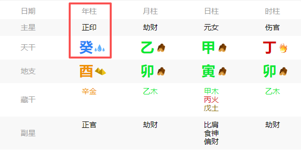 年柱是祖宫,年干出现正印,通常意味着家族文化底蕴深厚,容易出生在书香门第。命主从小得到关爱与庇佑相对其他十神来说会很更多,尤其是自己的母亲。因为童年生活较为安稳。所以塑造了命主温和、内向、好学的性格基础。任何事情都有两面性,正印的反面即使因过度受保护而产生依赖性,缺乏独立能力。